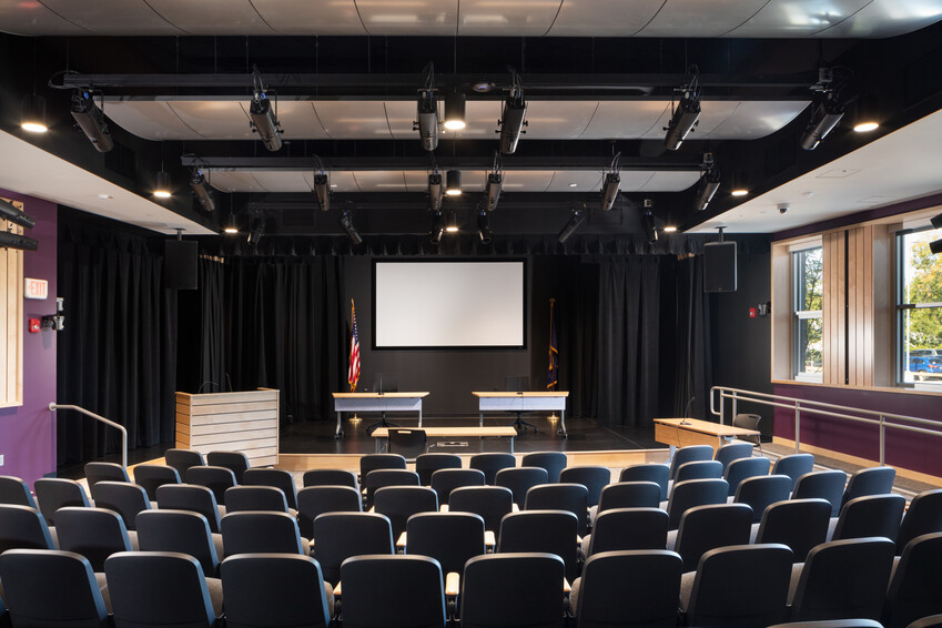 Configured like a lecture hall with a proscenium stage, full curtains and one set of wings, the Auditorium is acoustically designed and fully wired for streaming performances or remote participation meetings with seating for 100. Offering theatrical lighting, multiple POV cameras, lighting and sound pre-set controls, or a sound board available for certified users, the room is ideal for performances. Rear screen with short throw projector, confidence monitors, mics, tables/seating and lectern are available for meetings or panel presentations.